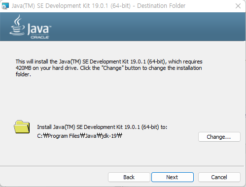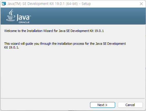 인스톨러 더블 클릭 시 팝업이 뜬다. 내가 다운로드한 Java의 버전이 19.0.1인 것을 알 수 있다.