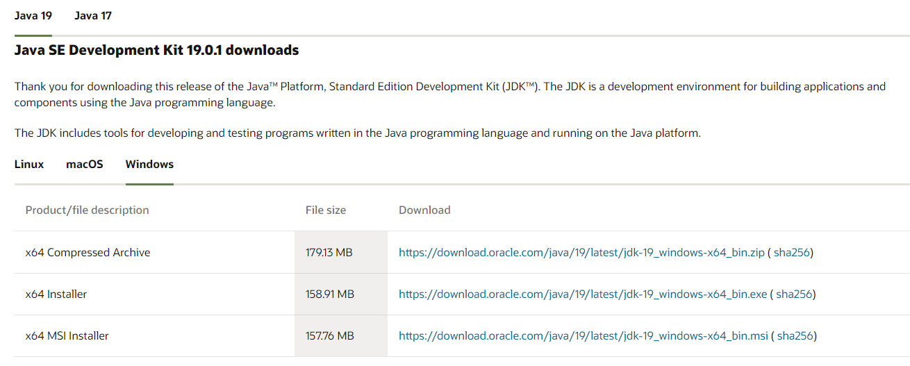 역사적인 이유로 표현을 다르게 하지만 위의 3개의 단어는 모두 동일한 버전의 자바를 가리킨다. Java(JDK)를 가리키는 말로, 현시점에서는 Java 19.0.1 버전이 최신 버전으로 릴리즈 release 되어있다. 회사나 학원 등 특정 그룹에 속해서 개발 도구 버전을 맞춰야 하는 경우가 아닌 이상, 프로그램은 제일 최신 버전을 설치하면 된다.