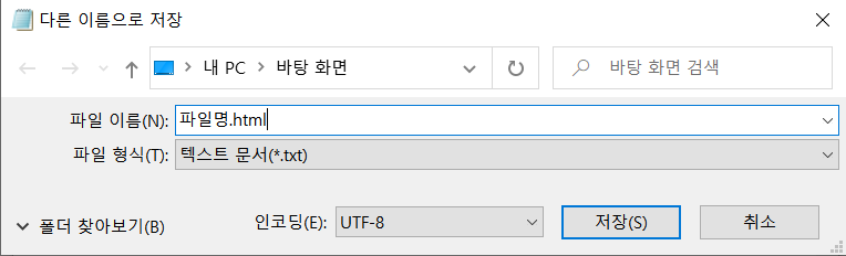 Step3: 파일형식을 모든 파일로 바꾸고 [파일명] 뒤에 .html(혹은 .htm) 확장자를 쓴 뒤 다른 이름으로 저장한다