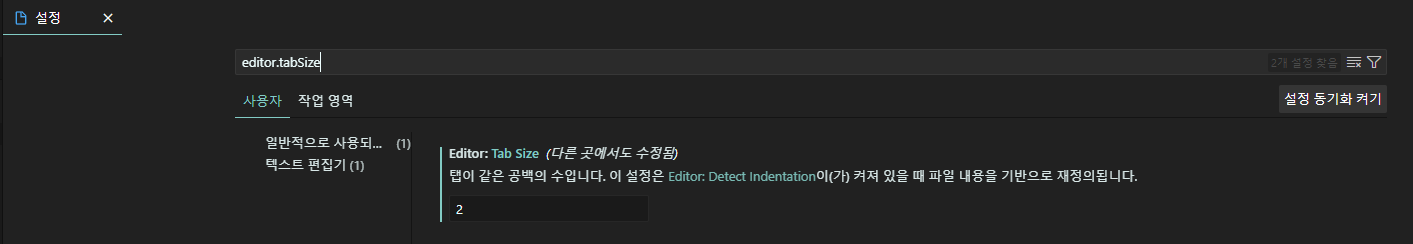 혹, 첫 화면에서 잘 못 찾겠다면, '설정 검색' 창에 'Tab Size 혹은 editor.tabSize'라고 검색하면 설정 메뉴가 필터링되어 관련 내용만 보이니, 이후에도 메뉴 위치는 모르지만 검색어를 아는 다른 설정 값이 궁금할 때 검색 기능을 활용하면 시간이 많이 단축되는 효과를 얻을 수 있다.