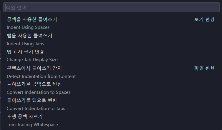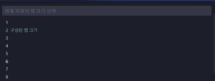 내피셜 가장 쉬운 방법으로 VS Code에서 새 파일이던 기존 문서던 아무 파일이나 열어둔 상태로 우측 하단에 표시되는 "Tab Size: 4"를 클릭해 주면 된다. 한국어 익스텐션을 설치했다면 "공백: 4"라고 표기되어 있다.