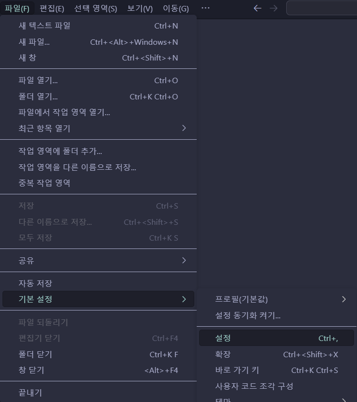 상단 메뉴에서 파일(F) > 기본 설정 > 설정으로 들어가거나 단축키로 접근할 수 있다.
