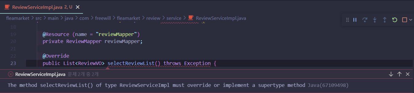 The method selectReviewList() of type ReviewServiceImpl must override or implement a supertype method