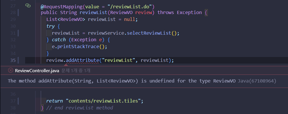 The method addAttribute(String, List<ReviewVO>) is undefined for the type ReviewVO