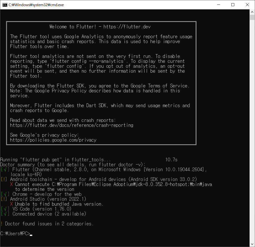 - cmd 창에 " flutter doctor " 입력 후 결과 확인