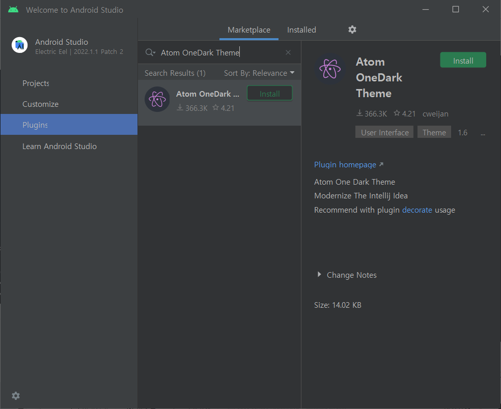 2-1-2. Android Studio 에서 Atom OneDark Theme 플러그인 검색 후 설치