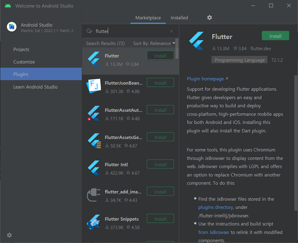 2-1-1. Android Studio 에서 Flutter 플러그인 검색 후 설치