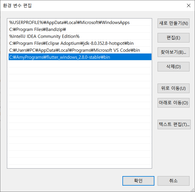 - 고급 > 환경 변수 > PC에 대한 사용자 변수 > Path > 편집 > 새로 만들기 > Flutter 압축 파일을 푼 경로의 bin 주소까지 복붙하기