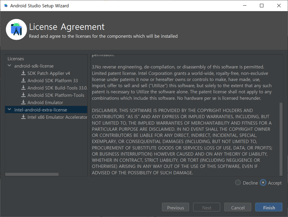 코딩애플에서는 Android Virtual Device 체크 해제하고 설치하라고 했는데 그냥 Next 누르느라 나중에 알게 되었다. 문제 생기면 지우면 되니까 우선은 그대로 진행하기로 했다.