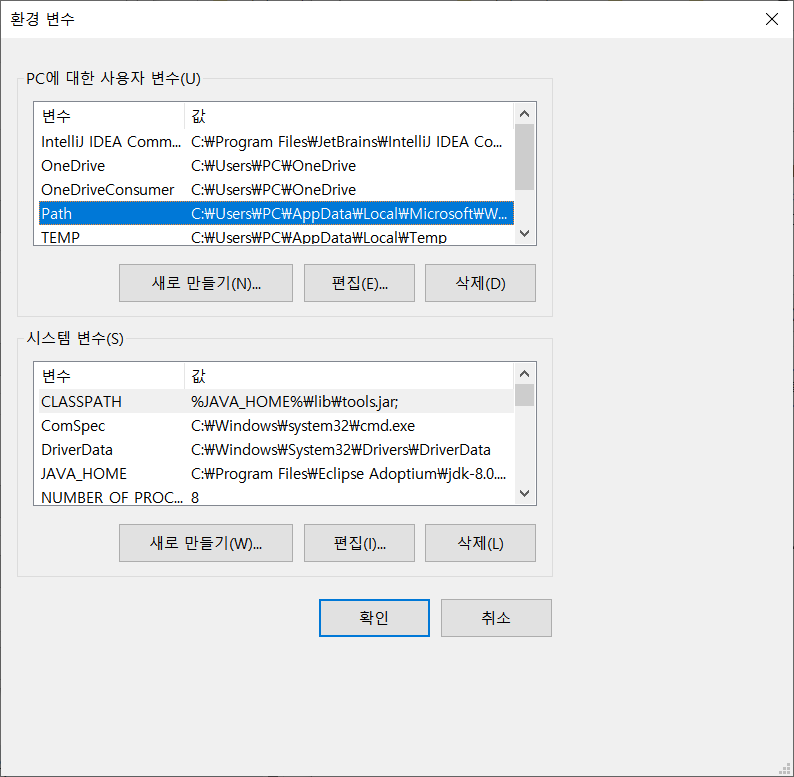 윈도우 키 눌러서 시작 메뉴에서 '환경 변수' 입력 후 검색 리스트의 제일 처음 나오는 '시스템 환경 변수 편집' 클릭