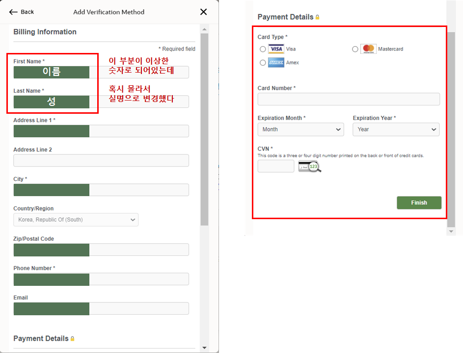 지불 정보 입력하는 곳이니까 혹시 다 적었는데 오류 날까봐 내 실명으로 고쳐 적었다.